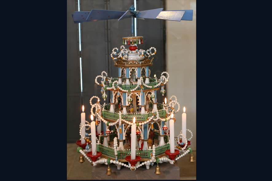„Schie war de Peremett, bluß giehe tat se net!“ Wer kennt das nicht? Man verändert die Stellung der Flügel, man setzt die Nadel neu auf, doch die Pyramide will und will sich nicht drehen. Wenn sie es aber dann doch tut, dann kann der Weihnachtsabend nicht schöner sein. Langsam drehen sich Bergleute, Engel, Waldleute, Jagden, Hirten mit Schafen oder die ganze Heilige Familie um den Kreis und werden durch die Kerzen immer anders beleuchtet. Das Flügelrad wirft seine bewegten Schattenbilder an die Zimmerdecke. Die Drehung darf nicht zu schnell und nicht zu langsam sein, dann beruhigt und entspannt uns das außerordentlich. Nicht der völligen Stille, sondern der sanften Bewegung bedarf unser Gemüt.