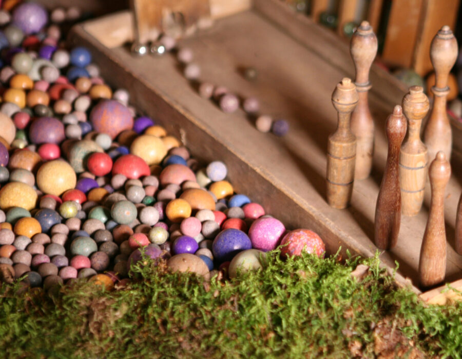 Während sich die Pyramiden aus dem sächsischen Erzgebirge drehen, so rollen die Glaskugeln, dort Märbeln genannt, aus dem thüringischen Lauscha. Durch die eingebauten Spiralen farbigen Glases ist dies zu beobachten ein besonderes Vergnügen.