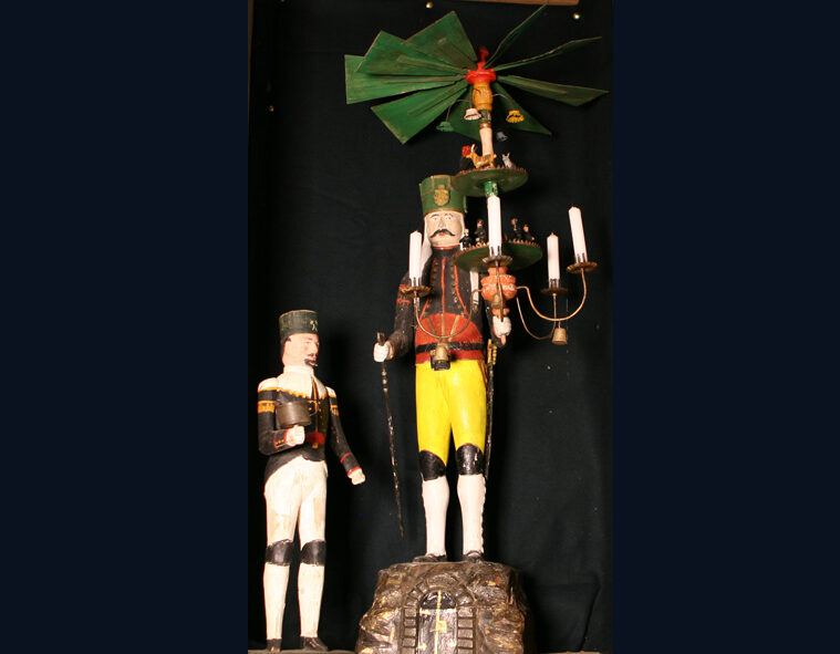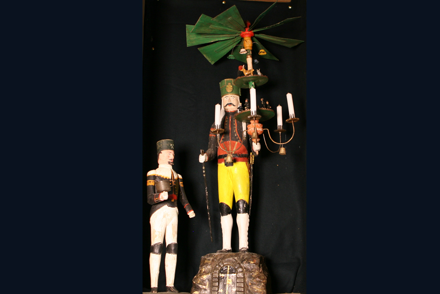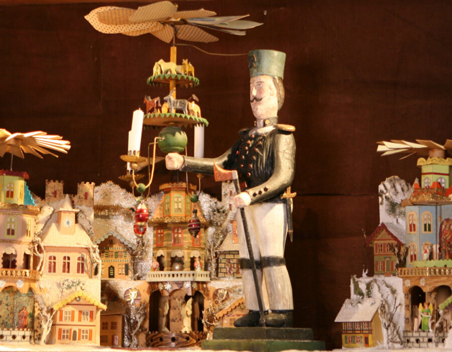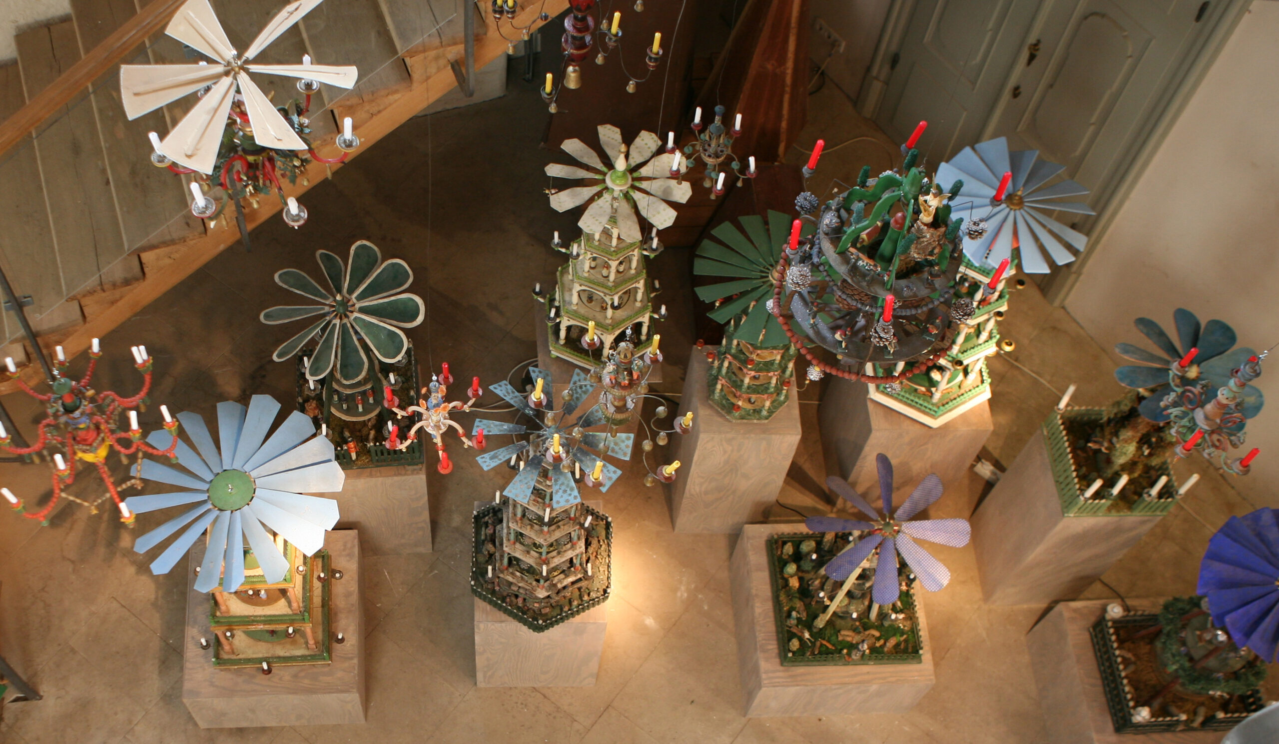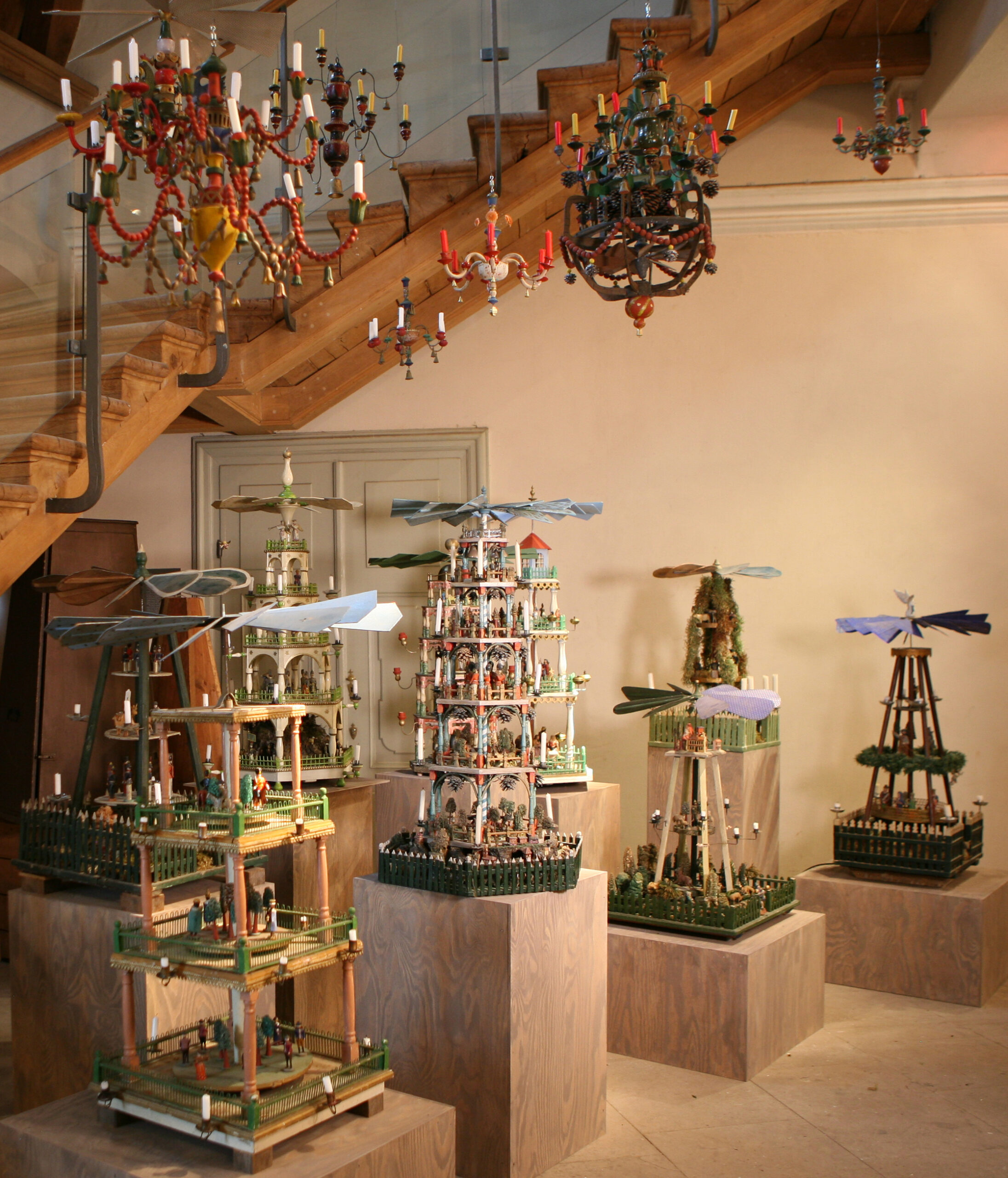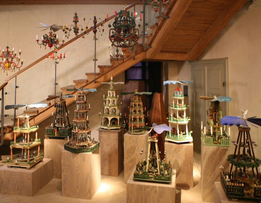 Auch von den in der Ausstellung gezeigten Stockwerkspyramiden stammen einige aus der zweiten Hälfte des 19. Jahrhunderts und sind mit besonders wertigen Figuren bestückt. Im Westerzgebirge waren es meist geschnitzte, dagegen im östlichen Teil die gedrechselten aus Seiffen, die den Weg auf die Drehteller fanden. Selten sind es noch die ursprünglichen Figuren, denn jede Generation nahm die eine oder andere Figur weg und gab eigene Lieblinge hinzu.