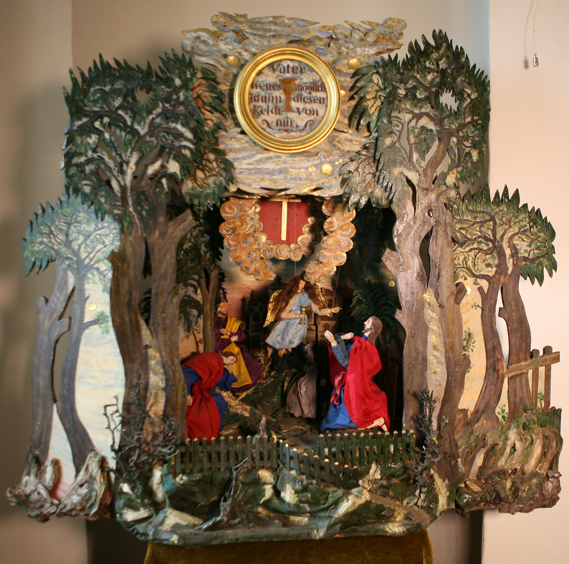 Stabpyramide mit Paradiesgarten voller Massefiguren, Ende 19. Jahrhundert.