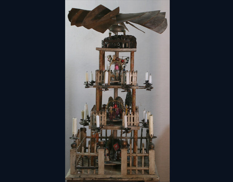 Diese Stockwerkspyramide mit Rüböllampen und Massefiguren erhielt Guido Fischbach zu seinem 1. Geburtstag im Jahre 1886.